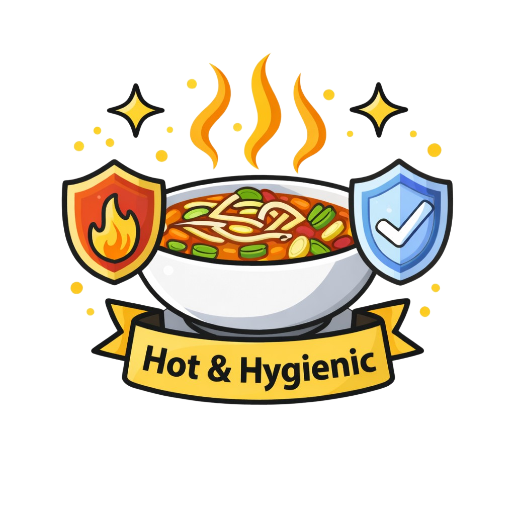 Prepared with proper hygiene and served hot to maintain taste and safety.